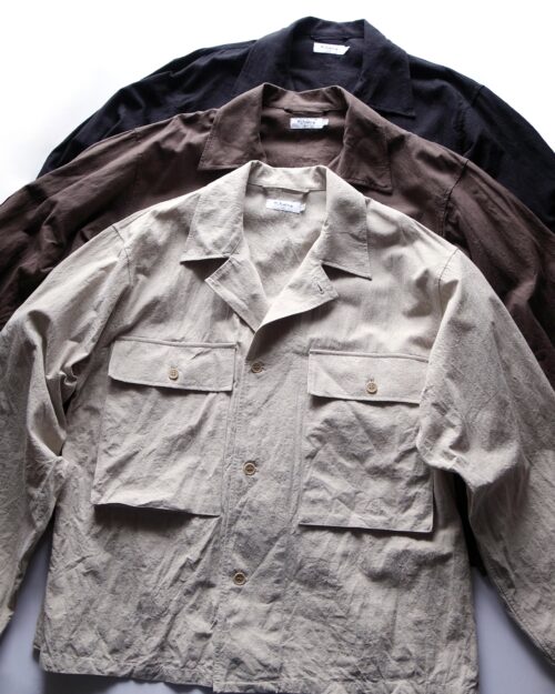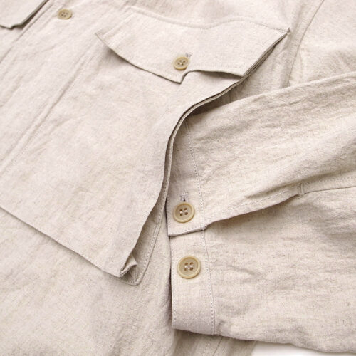 素材はリネン特有のドライな質感にコットンの柔らかさを掛け合わせたもので、ワッシャー加工で洗いざらしのようなナチュラルなシワ感がとても雰囲気良いですよ。肌離れが良く、気温の高い日でも快適に着用できるのが特徴です。