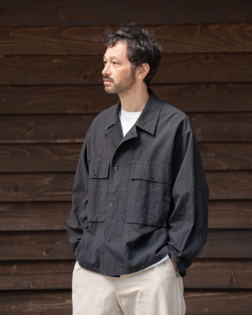 ジャケットは程よいショート丈で、広めの身幅やアームがたっぷりとした膨らみのあるゆったりとしたシルエットがリラックスした印象を保ちながらも全体を引き締めてくれます。シャツとデニムジャケットの間くらいの軽く、通気性の良い通年着れるコットンリネン素材の一枚仕立てで、Tシャツやシャツの上から気負わずガバッと羽織れる一着です。